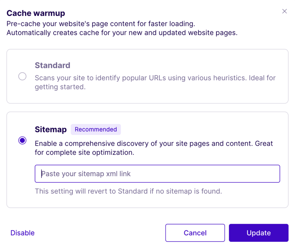 Yes, to use the Cache Warmup feature, first set up a source of URLs that the system can use to pre-optimize your pages. You can either rely on the homepage (Standard mode) or, if you’re on a paid plan, provide your sitemap XML for broader coverage.