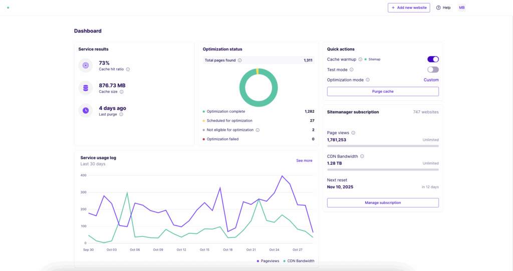 - Service Results & Usage: Quickly check the cache hit ratio, current cache size, and resource usage (pageviews and CDN bandwidth) to ensure everything is running smoothly.