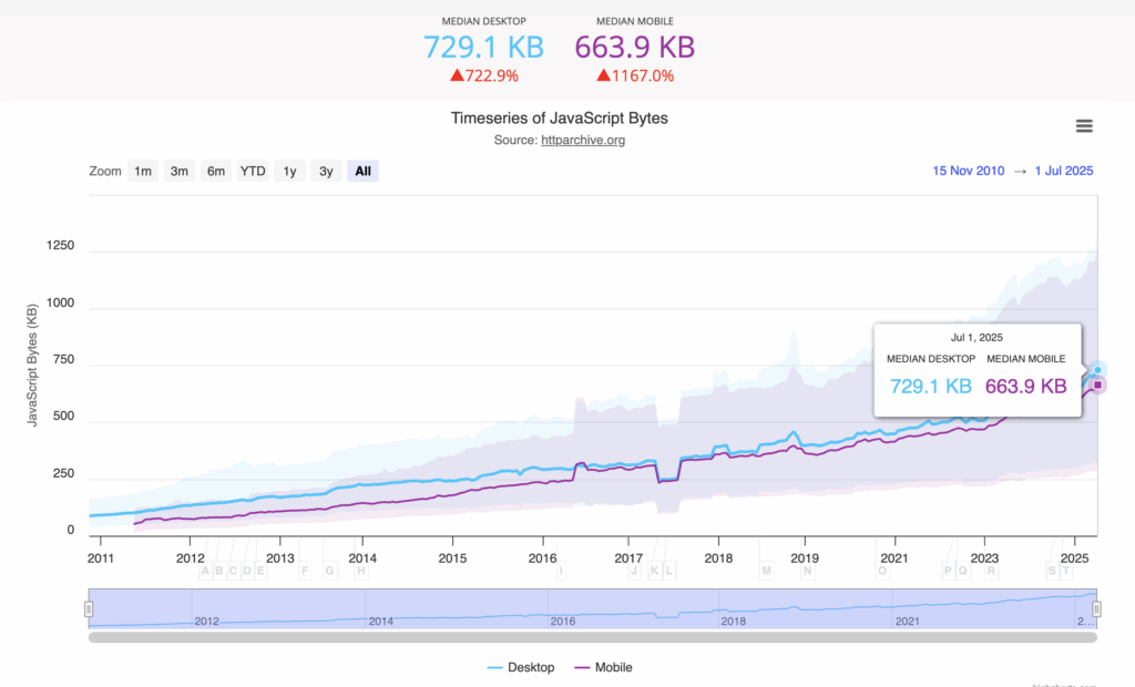 Unfortunately, things don’t seem to be getting better. Data from the HTTP Archive shows that JavaScript bytes and JavaScript requests have done nothing but go up since 2010: